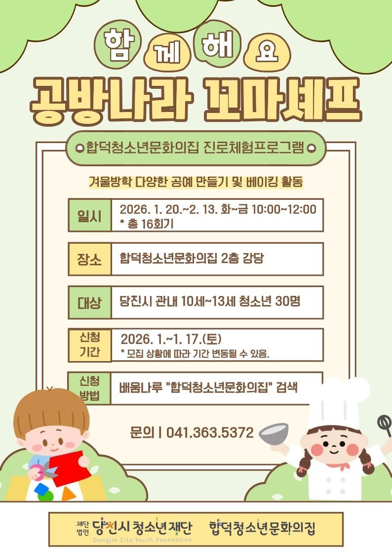 [충청25시] 합덕청소년문화의집은 방학 기간 중 공방나라 꼬마셰프 진로체험프로그램 2026년 1월 20일 화요일부터 2월 13일 금요일까지 화~금 10:00~12:00 총 16회기 다양한 공예 및 베이킹 체험을 희망하는 당진시 관내 청소년 초등학생 10세~13세 30명을 모집한다.