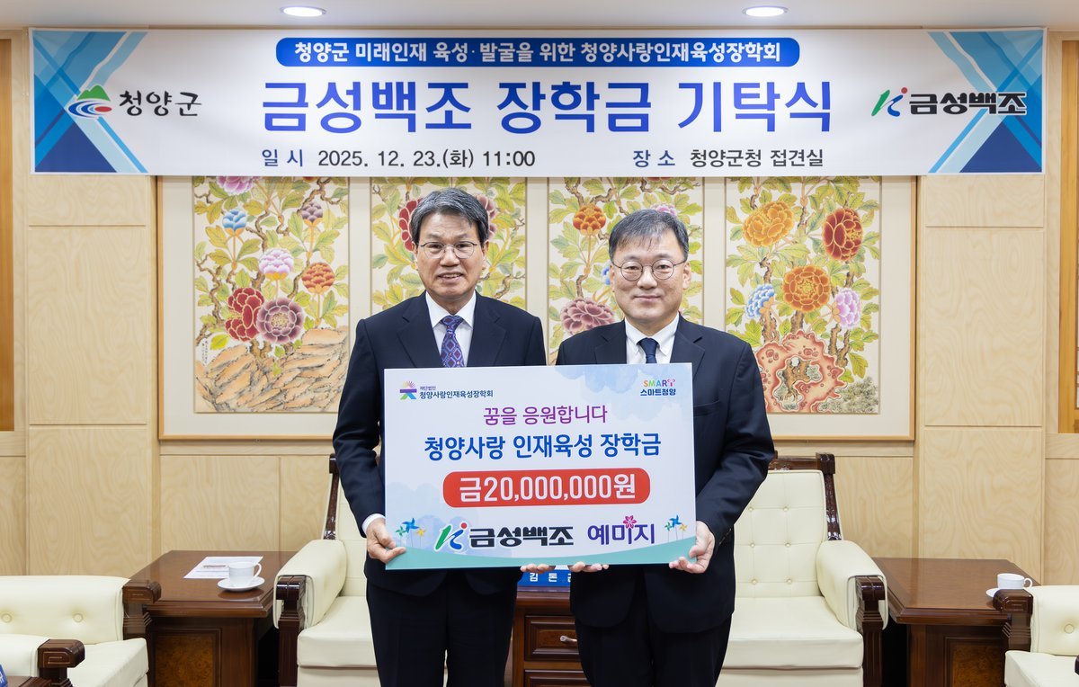 [충청25시] ㈜금성백조주택은 지난 23일 청양군청을 방문해 청양사랑인재육성장학회 김돈곤 이사장에게 지역 인재 육성을 위한 장학금 2천만 원을 기탁했다.
