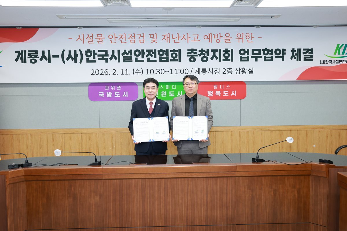 [충청25시] 충남 계룡시는 11일 한국시설안전협회 충청지회와 ‘계룡시 시설물 안전점검 및 재난사고 예방을 위한 업무협약’을 체결했다고 밝혔다.