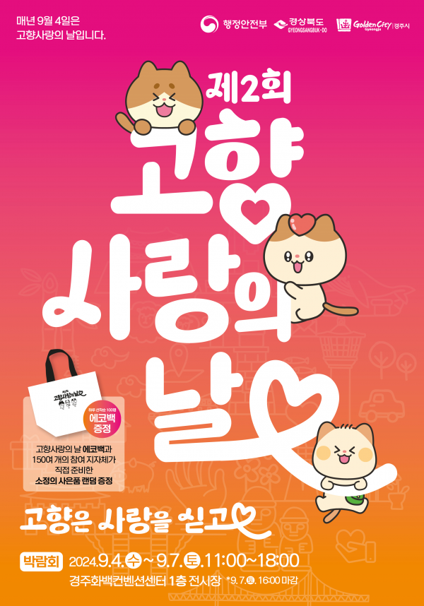 [충청25시] 행정안전부는 9월 4일부터 9월 7일까지 경북 경주시 화백컨벤션센터에서 ‘제2회 고향사랑의 날’ 기념행사를 개최한다고 밝혔다.