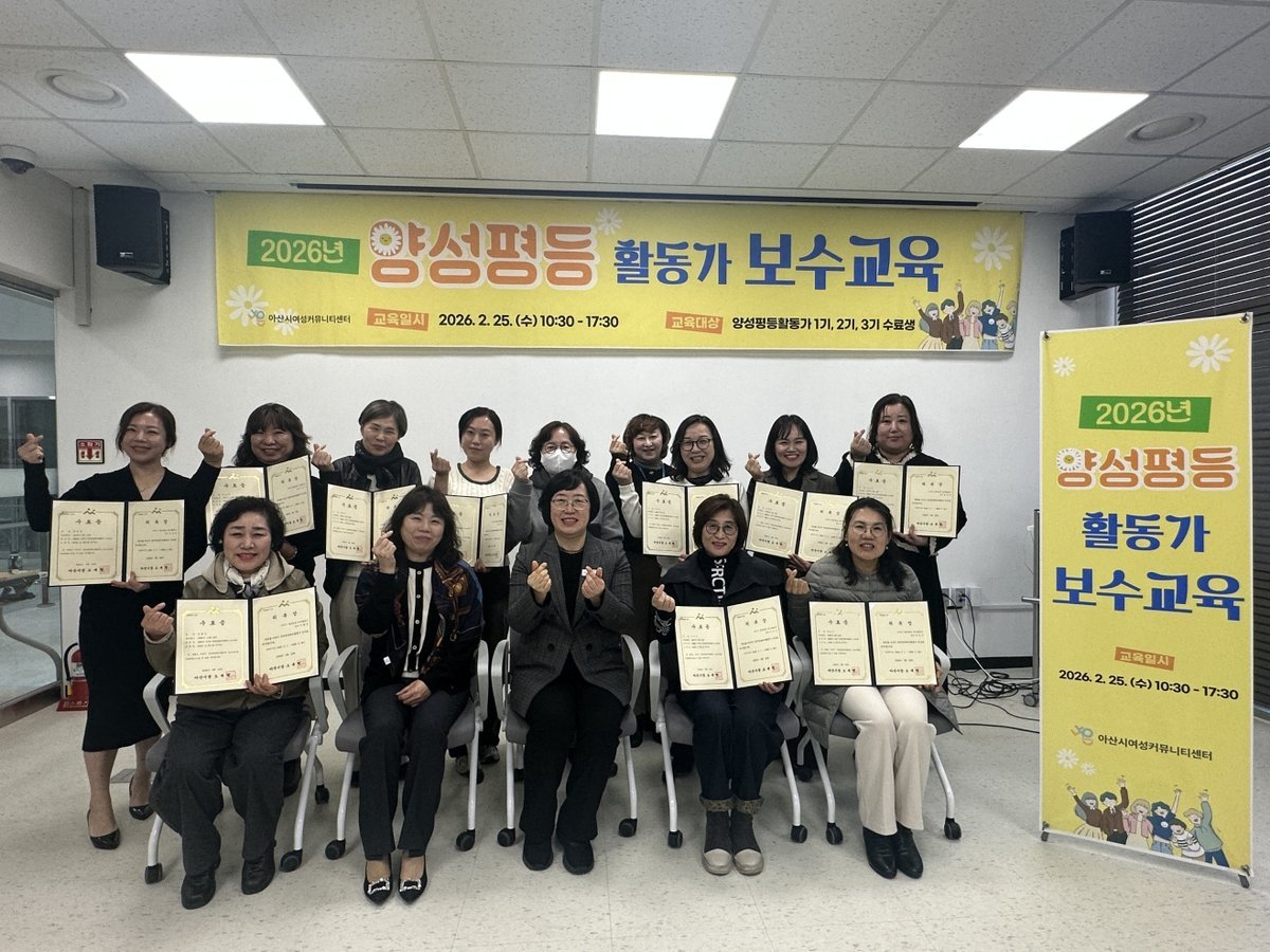 [충청25시] 아산시 여성커뮤니티센터 나온 은 지난 25일 센터 교육장에서 아산시 양성평등 리더 활동가 1, 2, 3기 수료생 11명을 대상으로 2026년 아산시 양성평등 리더 활동가 보수교육 을 실시했다.