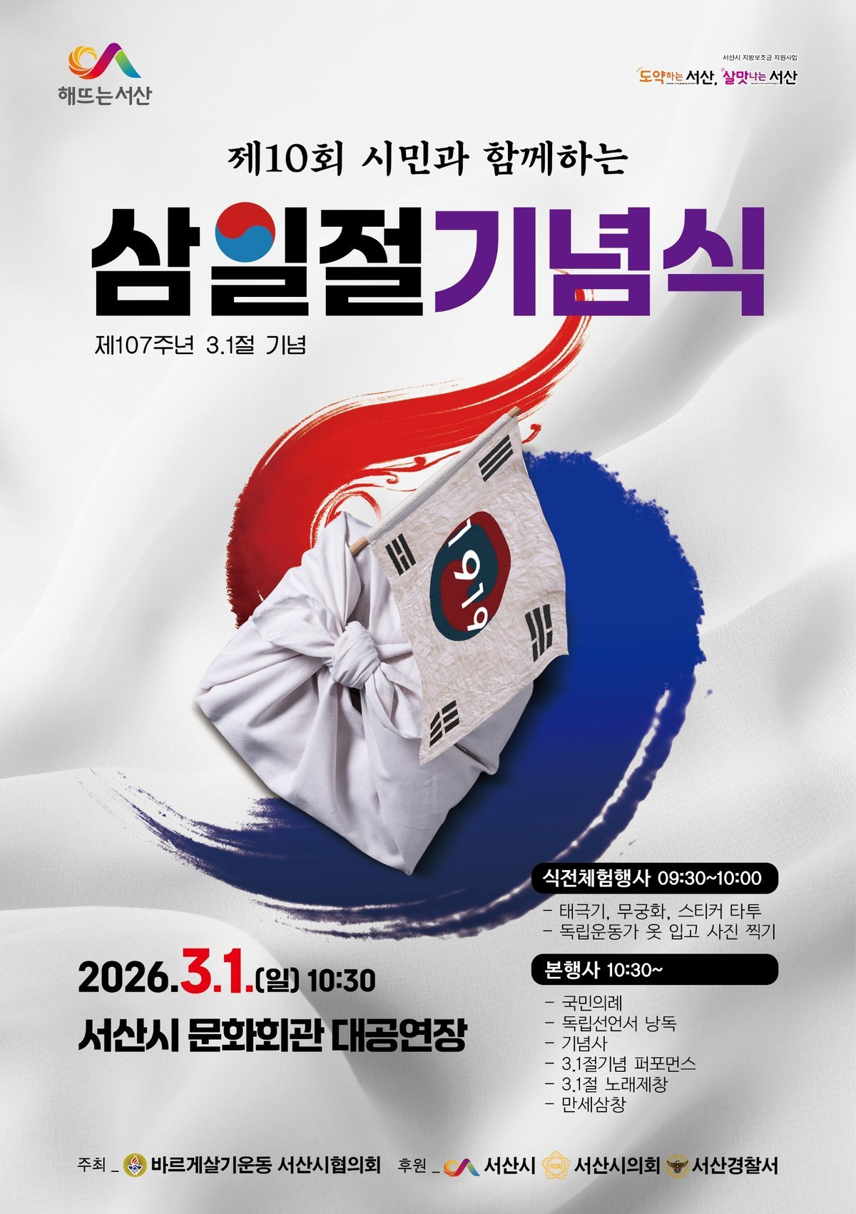 [충청25시] 충남 서산시는 오는 3월 1일 ‘제10회 시민과 함께하는 3·1절 기념식’을 개최한다고 밝혔다.