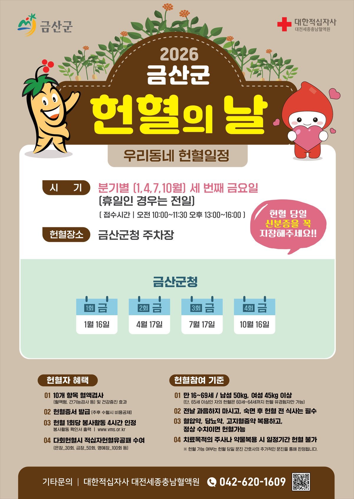 군은 분기별 1회 세 번째 금요일에 금산군청 주차장에서 사랑의 헌혈 버스를 운영한다.