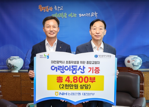 [충청25시] 대전시교육청은 9월 3일 NH농협은행 대전본부로부터 2천만원 상당의 어린이 종합 교양지 ‘어린이동산’ 4,800부를 기탁받았다고 밝혔다.