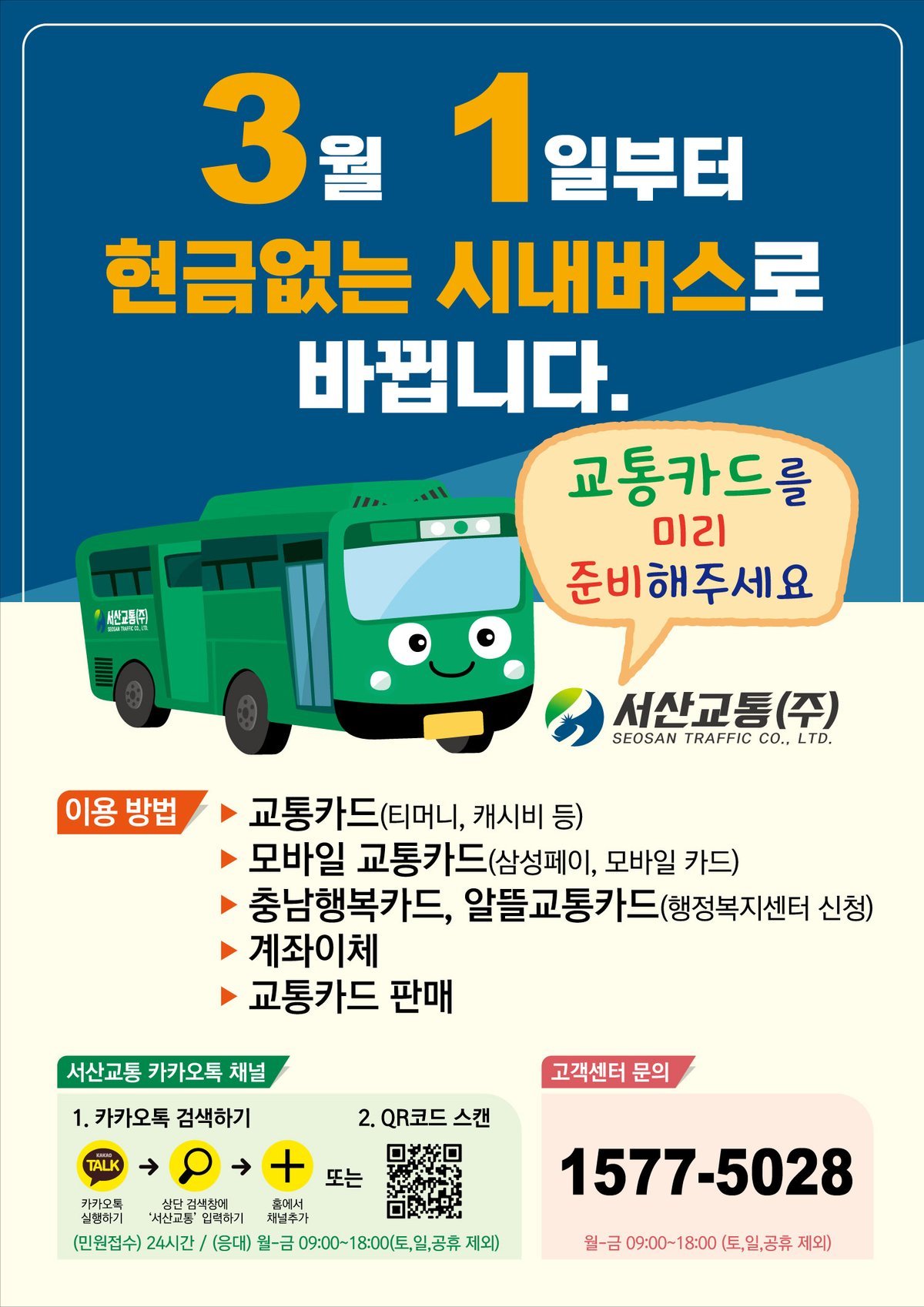 서산교통㈜은 올해 1월부터 읍면동 행정복지센터에 안내 현수막을 부착하고 홍보자료를 배부하는 등 현금 없는 버스 운영을 안내해 왔으며 향후 안내를 더욱 강화할 방침이다.