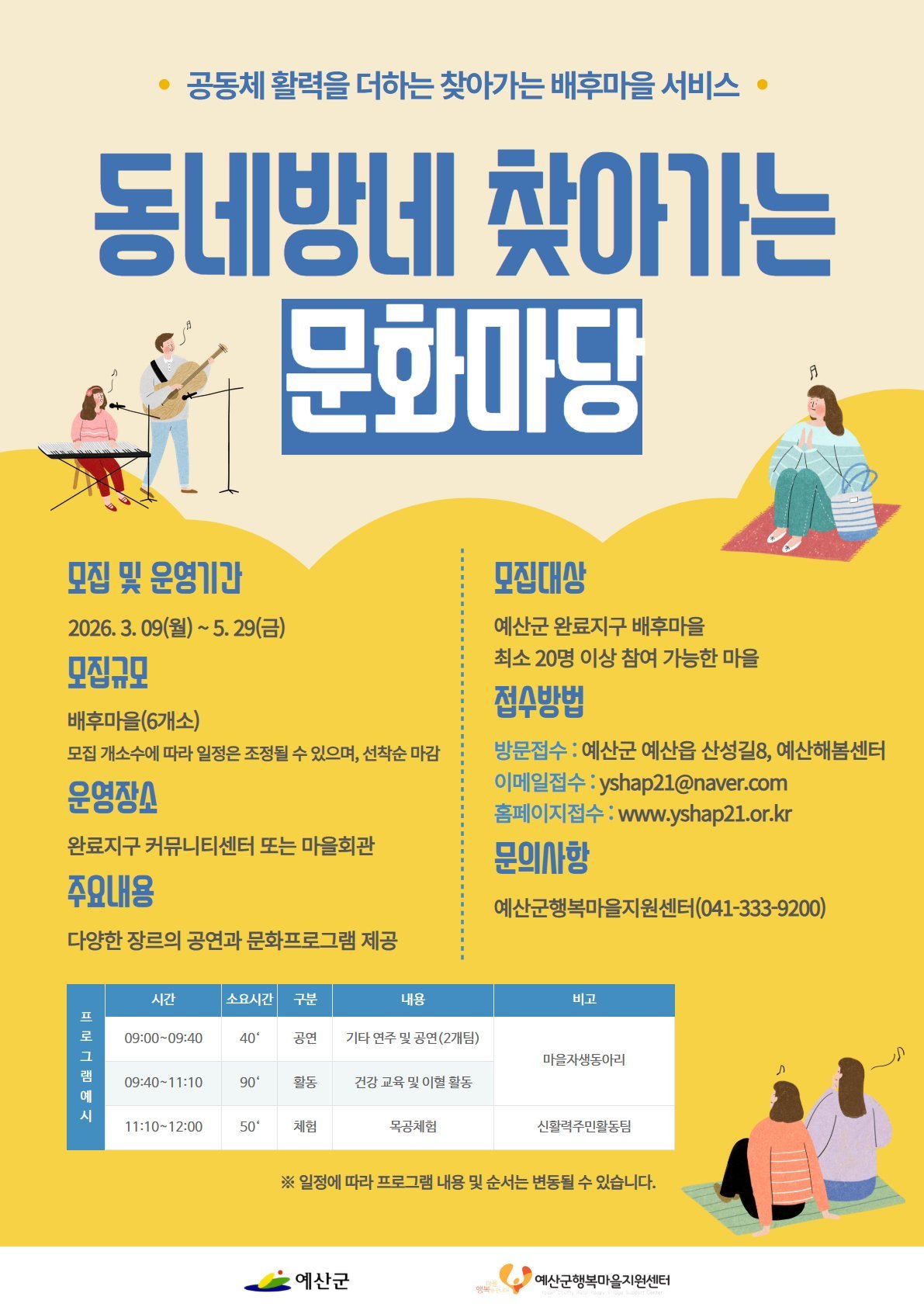 [충청25시] 예산군행복마을지원센터는 관내 농촌지역개발사업 완료지구 배후마을을 대상으로 맞춤형 문화 체험 프로그램을 제공하는 ‘동네방네 찾아가는 문화마당’참여 마을을 모집한다고 밝혔다.