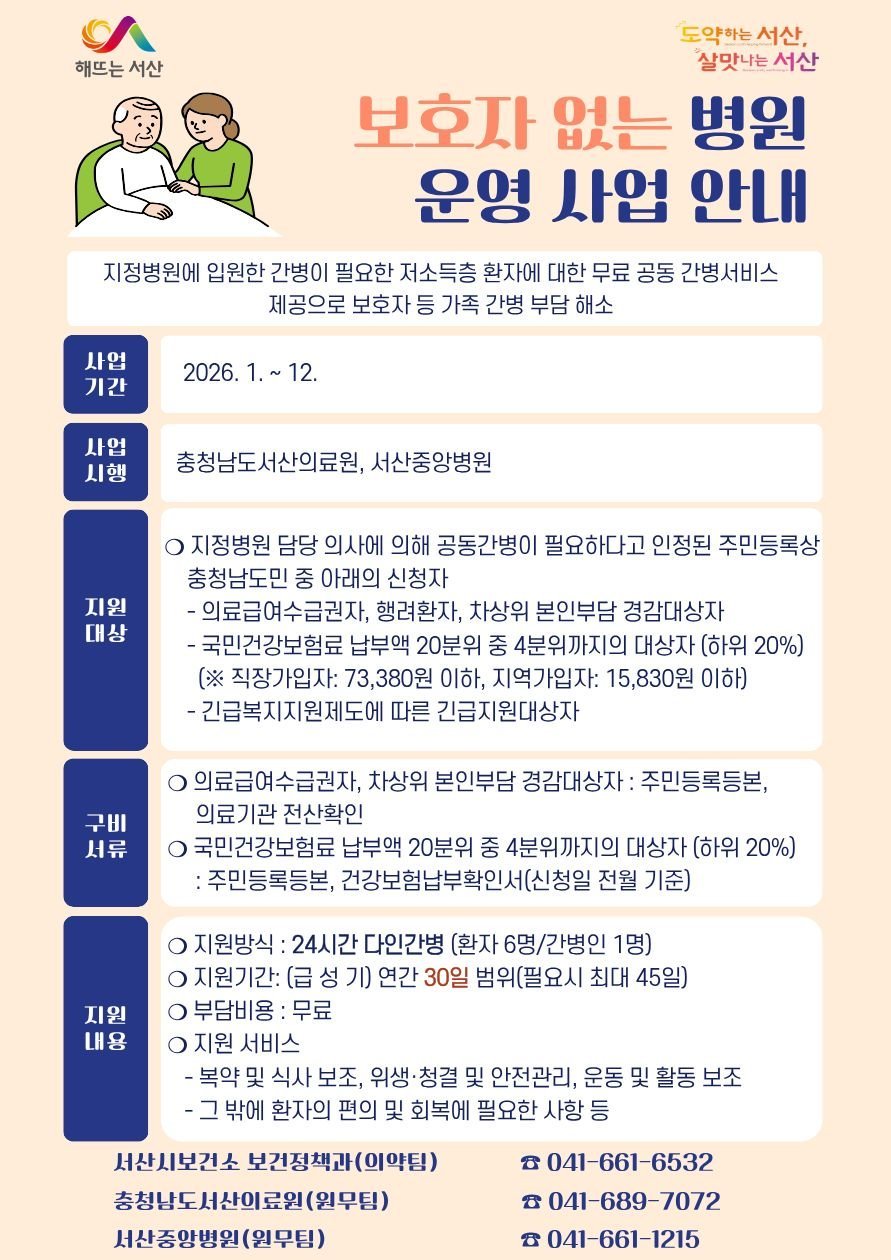 [충청25시] 충남 서산시가 저소득층 환자와 보호자의 간병 부담을 해소하기 위해 ‘보호자 없는 병원 사업’을 연중 운영 중이다.