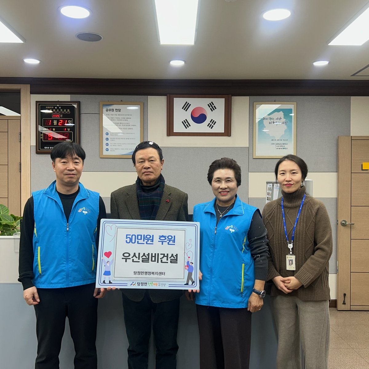 [충청25시] 우신설비건설㈜은 지난 21일 탕정면 행복키움추진단에 후원금 50만원을 전달했다.