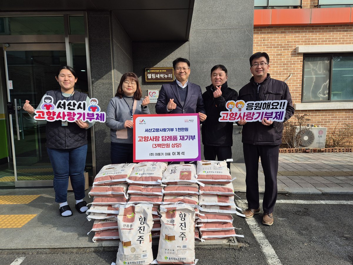 금년에는 고향사랑기부금 1천만원을 기부하고 그 답례품 3백만원 상당을 어린이 보육시설에는 쌀 30포, 한부모 가정 21세대에는 서산한우세트 각 1세트를 전달했다.