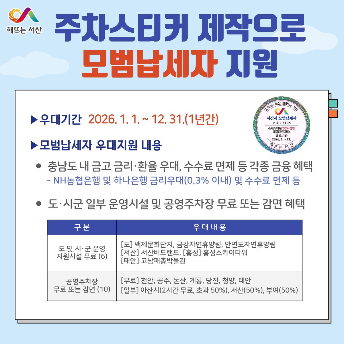 서산시, 모범납세자 차량 부착용 주차스티커 배부