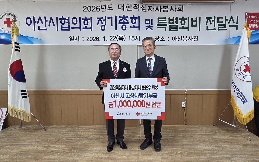 특히 이날 문은수 대한적십자사 충남지사 회장은 지난해 수해 복구 등 각종 구호 활동과 매년 취약계층을 위한 특별회비 전달 등 아산시의 적극적인 협력에 대한 감사의 뜻을 전하며 고향사랑기부금 100만원을 전달했다.